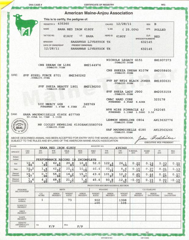 This nov 2011 red Steel Force X DCC Mercy Daughter bull is one we bred for calving ease and maternal prowess. He has the genetics to produce some outstanding females. His mother goes back to Camp Cooley SAF Mademoiselle 6180 genetics and his sire needs no introduction.