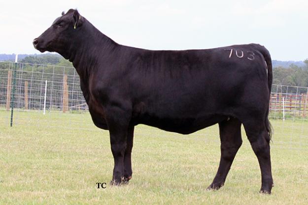703 is a huge footed heifer that has the neck extension and length to mature into a great bred heifer. She has an excellent look on profile and so sound moving still doesn’t let you down when studing her from behind. We purchased this heifer alongside her dam this past spring with the intent of keeping this female. However, after deciding to do an online sale we decided to include her with the offering as nothing is held back. This heifer is a member of our show string and will be very competitive. She has an impeccable pedigree and a phenomenal set of EPD’s. Another heifer that will be fun to feed and watch improve and take home the purple!