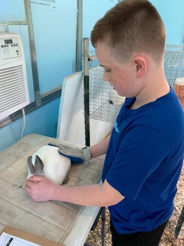 Grade 5 - RABBITS - This my third year to show rabbits. We breed our own in this county which means we have them year-round. Our babies are born 30 days after breeding. They need to be 10 weeks old at the fair. We feed them daily 18% protein to start then 15%-16% protein leading up to the fair along with a conditioning mix that contains black oil sunflower seeds oats barley peanut oil and ground flax. It is important to make sure they always have fresh water. We brush and weigh them every few days to know we are in the weight limit which is 3.5 to 5.5 lbs. The judge is looking for a pen of three rabbits that are identical and since they are meat rabbits it is best for them to be tall wide and with a good skirt. Thank you for helping us with the sale.