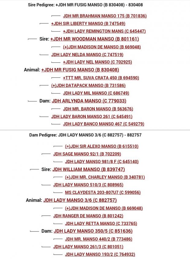 Lady L Natalya Manso 132 is a daughter of +JDH Mr Fusig Manso 226/1, the prominent son of +JDH Mr Woodman Manso. Her dam JDH Lady Manso 3/6 combines JDH lines including Sage, Charley 590, Alexo, and Madison.