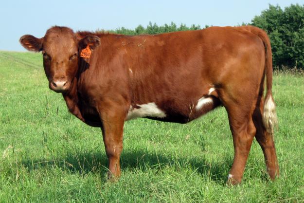 A moderate framed Ivryleague heifer from a Newcomer cow. Newcomer was a solid red, medium framed son of Loulou.