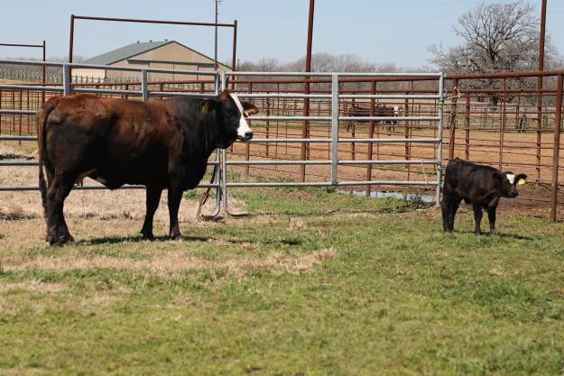 This is a great way to kick off our Brahman X Hereford section. This is an AMAZING chocolate white faced female. She is an ABBA Golden Certified Brahman X Hereford F-1 female with a 30 day old Angus sired calf. Remember that the calf at side is eligible to be enrolled in the ABBA F-1 Plus Program.
