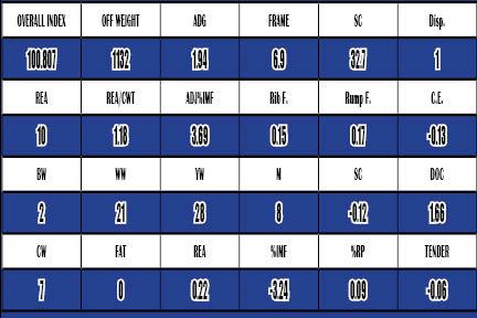 Kara Boy 53/7 has been on our radar since his birth. His natural thickness, spring of rib, which extends through his front end, plus his perfectly sound and muscled body will make him a special breeding piece. His sire, JDH Mr. Manso 663, has had offspring in every ABBA bull test and 100% of his bulls have not only made the sale, but have excelled in both muscling and marbling. He also boasts (+)JDH Atlas Manso 328/4,(+)JDH Madison de Manso, (+) Mr V8 212/3 and (+) Mr V8 202/3 and (+) JDH Lady Manso 286/7 in his pedigree.Kara Boy 53/7 combines the phenotype and performance that we strive to achieve. He is a moderate framed, deep ribbed, heavy muscled bull that boasts a low birthweight. We feel this bull incorporates both proven genetics and performance and will have a positive impact on your herd. You can thank us later!!!