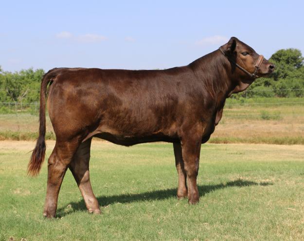 Miss Annie A-131 is a feminine baby doll sired by J7N Maximus who is a Boomerang (Black Joker x Queen Ann) son out of La Morra Ranch's MATRIARCH COW LM Knock Out Muneca M9. The M9 cow is the great grand dam to the popular and many times champion, LMC WFC Dream Girl, who sold for a modern day record of $42,000.00 at MAS VI to BETM,6G, LMC and Louie Flores. Annie is a Simbravieh. Her dam is LMLF JOYA T166 who is a MR. BOR ENCINO daughter.