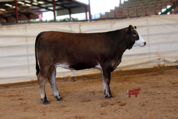 This red,blazed face heifer is out of a cow we bought from Pine Ridge Ranch and bred to their herd bull Ammo Power 977U. The quality is there to become a great cow in your herd. She sells open. For more information call 214-542-8162. Consigned by Enrique Barreda, San Salvador Ranch, Monterrey NL Mexico.