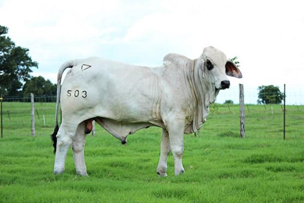 Mr Broken Triangle 503 is the largest framed bull of this offering, however he certainly is still very acceptable. His pattern is extremely easy on the eyes. His masculinity and style will be impressive in any pasture. He is a bull with great breed character, dark pigmentation, a clean sheath, and very sound in structure. He has a nice pedigree, combining some of Hudgins’ very best. 503 is sired by JDH Mr Manso 114/6, our +JDH Elmo son and out of Miss MK 905, one of the most impressive cows we purchased from McKenney Farms. She is a +JDH Karu bred female and will also be added to our ET program this fall. 905 has 4 daughters in our grey herd and they are all really nice producers.
