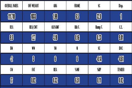 ( see footnotes for first place bull tag 65 ) 286 s dam is a half sister to the dam of first place bull and dam of the 2nd place bulls mother.That line of females are very productive and efficient . His dam has had 8 calves without a miss and 369 calving interval on 8 calves. 286 is a deep ribbed moderate thick made bull with a clean underline. 286 is in the top 2 % for birth weight and marbling epd and the top 1 % for calving ease .