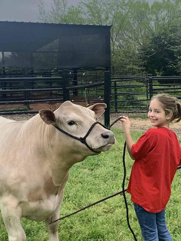 My name is MaKenna Skinner and this is Titus. This is my second year showing steers at Robertson County Fair. Titus is a Charolais cross that I purchased from my grandpa when he was a baby. To say that he has been challenging would be an understatement. He is a very piky eater he did better eating at night. Therefore I had to change his feeding program and feed two feeds at night. I enjoy showing cattle because it is a fun family time. I have also met so many new friends who I know will be life long frienfd. Although this year has come to an unexpected end I do look forward to showing next year.