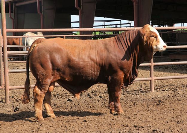 LMC BBS Modelo is the most challenging bull of the offering. He has the most muscle, the most front end extension, possibly the most length, is the most moderate in frame score and has the most eye appeal but has a little extra sheath which when you consider that 90% of Simbrah females do not have much of a navel should not be a problem. However this extra leather makes him a great choice for a Club Calf Sire to use on Clubby cows to produce American cattle with power, bone, early maturity, muscle and that fancy red ring eyes look that he offers. He is sound as a cat, is halter broke and has lots of semen sales potential.