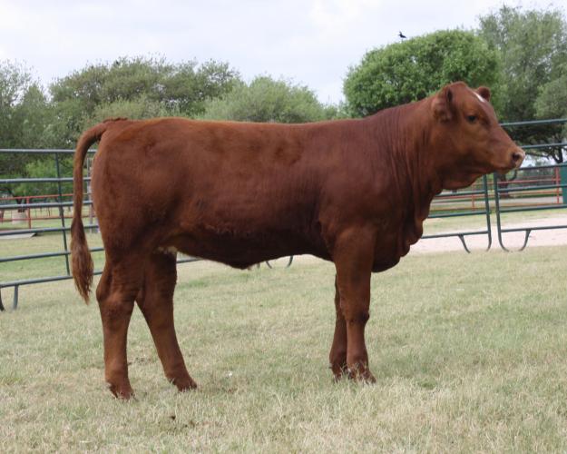 This solid red show heifer prospect is super thick, long body, strong spring of rib and moves very well. She is very gentle and will make a great show heifer for any young junior. We are excited about this heifer's future. She is out of LMC Red Buck X 5W Cowgirl Up. LMC Red Buck is a super thick, clean, structurally sound heard sire. 5W Cowgirl Up Is a many time champion and has done great things for our breeding program. This heifer is halter broke and sells with 2 units of TK/FCC Hard Body.