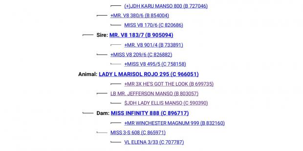 Here’s a cherry red heifer that comes with a little extra power! She is extreme in her width of top, has a tremendous hind quarter and moves like a cat. Marisol is sired by the black 380/6 son, Mr V8 183/7 “Gator” whose semen is becoming increasingly scarce and valuable. Her mother is a deep bodied broody daughter of LB Mr Jefferson Manso 766/3, and out of a +Winchester 999 cow. Another outcross pedigree with limitless breeding potential. 295 made her debut at the SUPERBOWL of Brahman shows; Aka, the Houston ABBA International Show and won her very competitive class #1 of 20 red heifers….They say “The proof is in the pudding”…..so here she is!