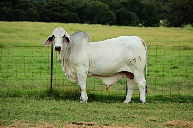 505’s dam, Miss Belle 25, is a nice, productive cow with a good udder. 505 is a white-colored bull with light pigmentation on the bottom of his lip. He is the type of bull that will work extremely well in a crossbreeding program by producing those really broody, soggy, tiger striped females that are so popular, the ones that top the sales.