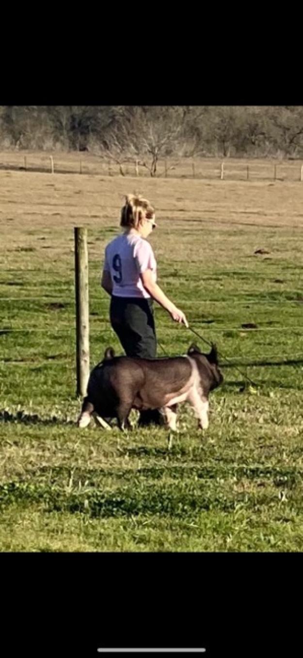 Grade 9 - HOGS - My name is Zana Pruitt. I am a freshman at Bremond High School. I have been showing pigs at county and majors for 7 years. This year I raised a gilt to show at the Robertson County Fair. Her name was Little. It fit her perfectly because when we got her she was so tiny and was the cutest little thing ever. This year showing has taught me that things don't always go as planned but the show will eventually go on! I've had to adjust to a busier schedule than I was used too since I am in high school and playing sports. My siblings and I tend to the pigs daily. We feed walk brush and spray them down every day. They are washed every other day. We clean pens and put in new shavings every week sometimes sooner. I really enjoy being involved in the show world!