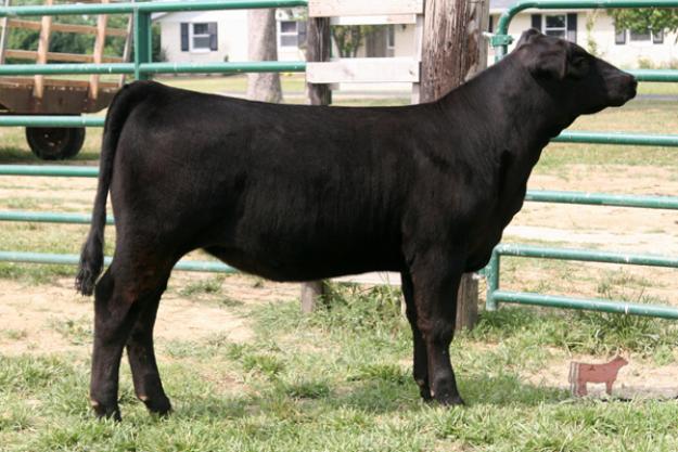 This heifer caught every visitor's eye from a very early age this spring. She is extremly angular and attractive through her front and extra stout and square through her hip. Her mother was shown six times in 2008 and won her class or went further in five of those six shows, including being named the Reserve Junior Champion Bred & Owned Female at the Indiana Junior Angus Preview Show. She carries herself with the same combination of look and power that made her mother so successful.