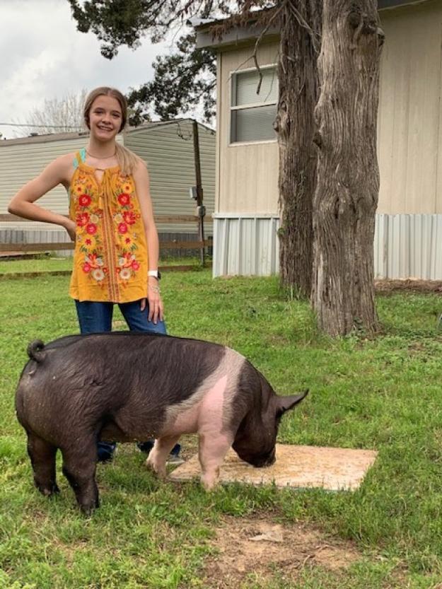 Grade 8 - HOGS -Hi my name is Macenzie Sanders and I am in the 8th grade. I am showing a Hampshire pig. My pig is a female and her name is Wilma has current weight of approximately 225 pounds. Wilma is feisty but as more time goes by she is getting better day by day. Wilma is a very energetic pig. She also loves to bother me when I clean her pin. Wilma also loves when I take time to condition and brush her. Wilma loves her food like just me. Every evening I walk Wilma for 10 minutes. I have enjoyed working with Wilma this year and experiencing new things as I’m learning new things I never knew. So I appreciate the chance to sell my pig and thank you to all the ones putting this online event together.