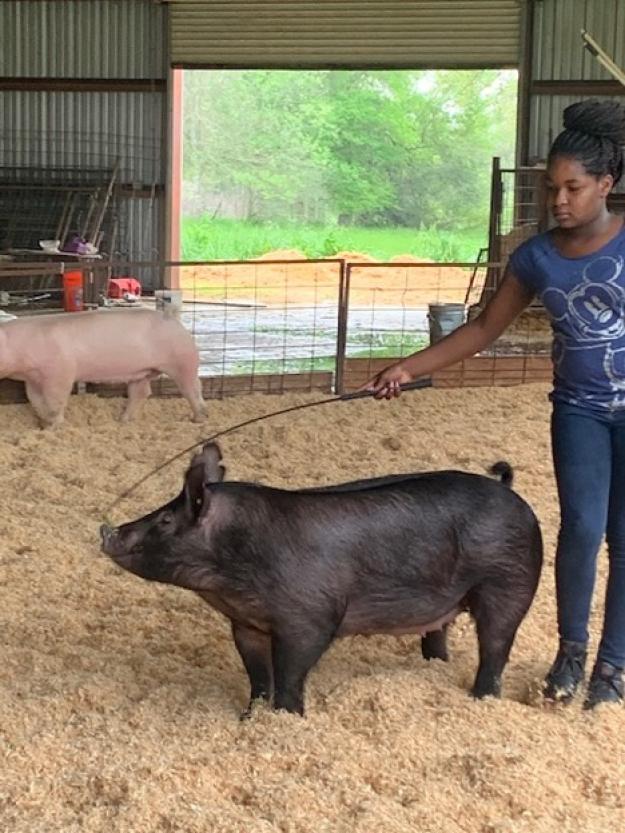Grade 6 - HOGS -Hello My name is Ne’Amiyah Wells and I’m in the sixth grade. This is my third year showing in the swine category. While raising my piglet I’ve learned how to manage my time better and become more responsible. As I was getting to know my pig I named her Kizzy. Kizzy is a black cross breed. Although she can be stubborn I’ve learned to get along with her with sitting walking and feeding her. Now it’s easy to feed and walk her. This experience has taught me how important it is to work hard be more dedicated and accomplish goals as if showing was sport.