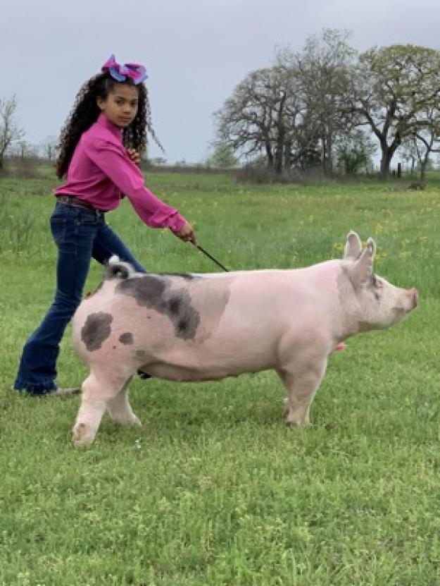 Grade 3 - HOGS - My name is Maya Wortham and I am showing a market gilt. Her name is Kali. I named her that because she is calico. This is my first year showing and I am very excited. Kali was scared when I first got her. Eventually I got her to calm down by putting time and effort into her. I learned lots of new things this year. The main thing I learned was about feeding. I had to feed her twice a day. I had to be careful because if you didn't give the right amount of food then Kali could get an upset stomach. She weighs 230 pounds. I also had to walk her everyday so I could get better at showing and she could get her exercise. The main thing was keeping her pen clean this is something you also have to do daily. I am thankful for the opportunity.