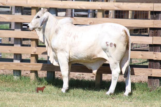 Mr Broken Triangle 509 is a beautiful light grey colored bull with a nice clean sheath. He is sound in structure and is impressive in the pasture as well. 509 is sired by JDH Mr Ray Manso 235/4 that combines the breeding of (=)JDH Sarasota Manso 880/2 and +Mr V8 189/4. 235/4 is doing a great job for us.
