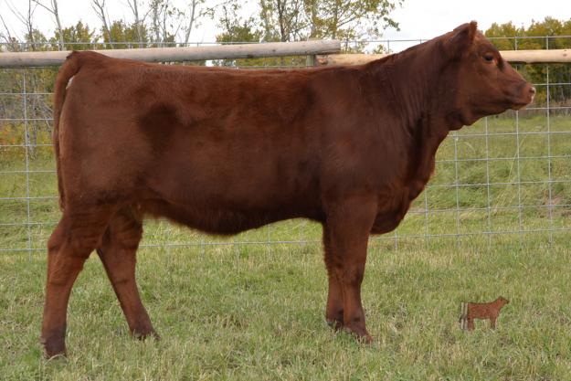 Here is another long bodied fancy cut daughter of Designer 63X. Syringa 45A traces back to one of the original foundation females that we purchased in 1987 from Moose Creek Red Angus to start our Red Angus herd. Kapton 7M who appears in the bottom side of this youngsters pedigree was a powerhouse show bull who turned everyone’s head during the fall of 2004 where we was the Grand Champion Red Angus Bull at Canadian Western Agribition. Best of all is the High Capacity breeding in her tabulation as each and every daughter of his that we have seen is a powerhouse of a producer. This heifer perfectly combines herd history, championship titles, proven production and future excitement. We hope you find her in the sale offering!
